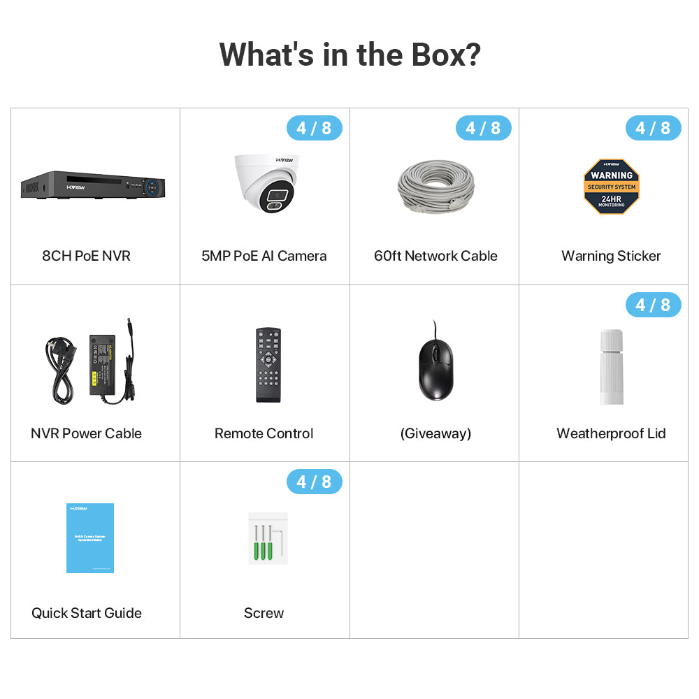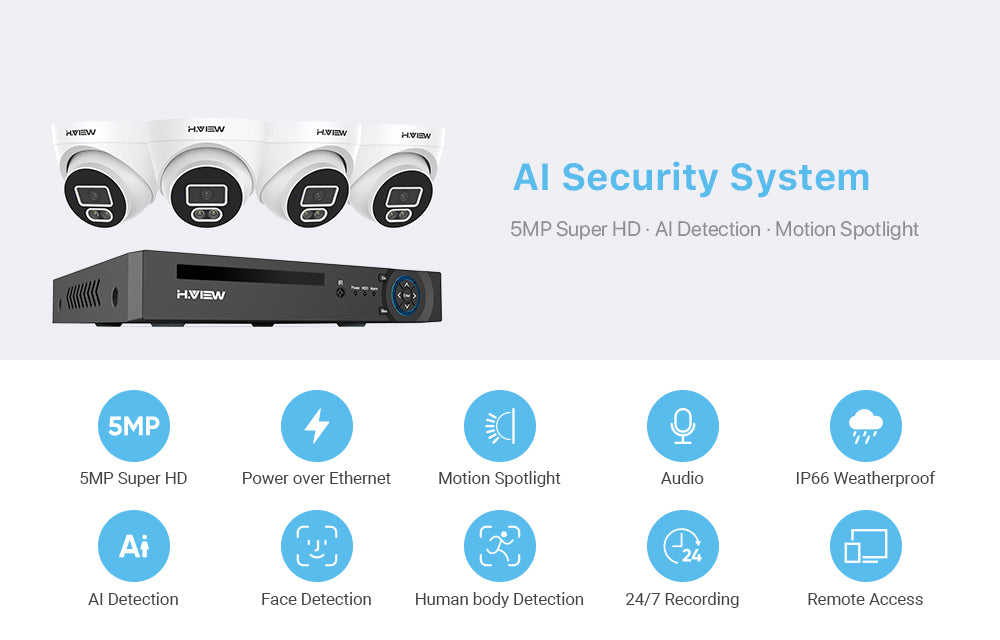 H.VIEW H.265 5MP POE Security Camera System, 4pcs Spotlight IP Camera, AI Detection, 5MP 8CH NVR , Support 4TB HDD for 24-7 Recording(HDD No included)