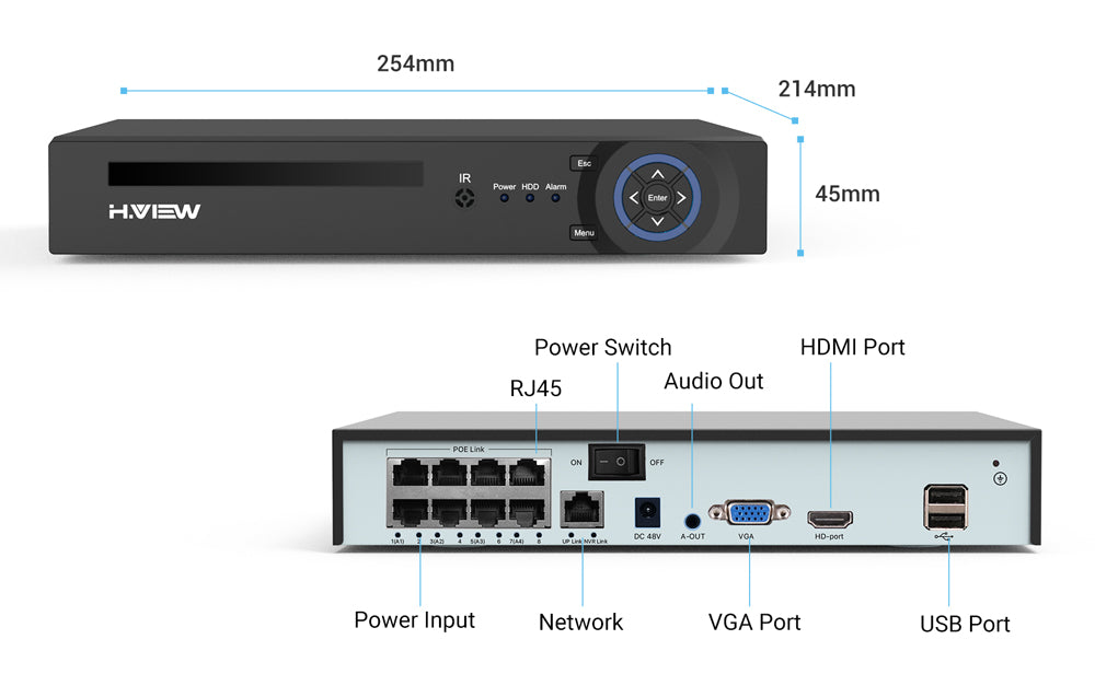 Power over Ethernet means the IP cameras connect to with a single cable that transmits both data and power. No power adapter is required, lower risk of electric leakage and easy to set up.