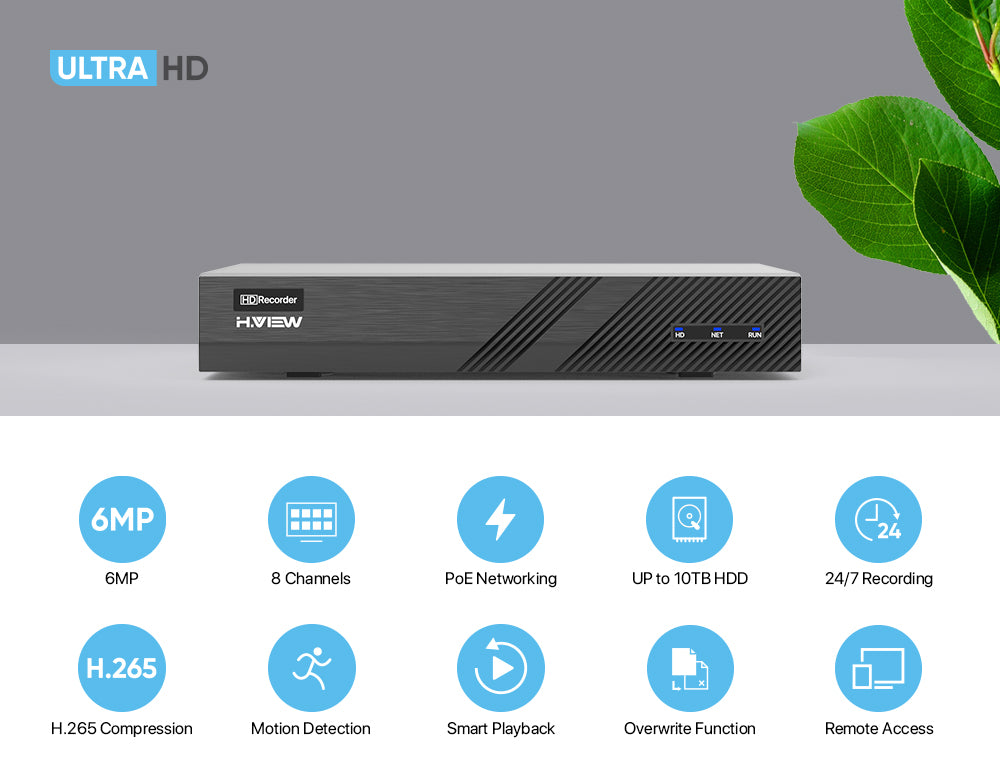 H.VIEW 6MP 8CH PoE NVR Supports 8 x 6MP IP Cameras (HDD Not Included)
